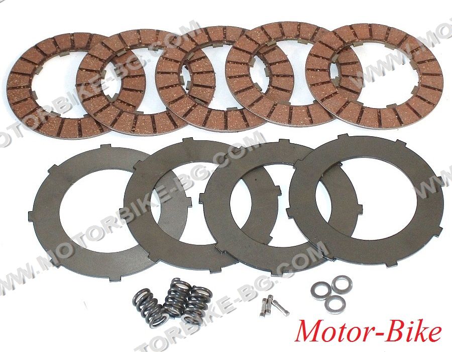 Catalogue number: 150-28-021 Serial number: 151-28-021 Complete set for one motorcycle. Set contains: 5x Clutch plates - pressed cork 4x Clutch plates - steel 3x Clutch springs - steel ... Доставно тегло: 0,940 кг